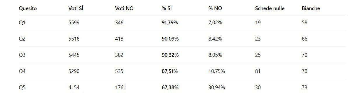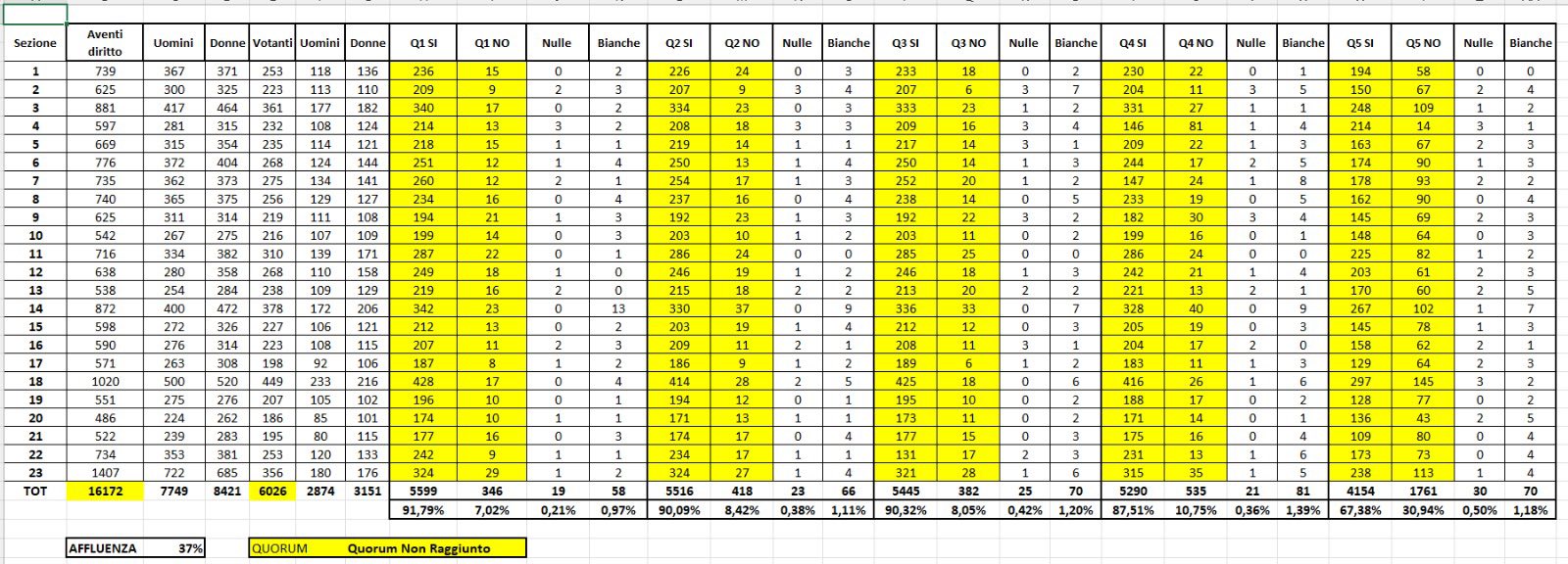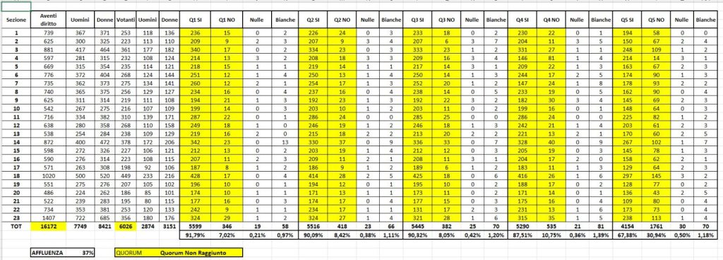 Referendum a Giovinazzo: di seguito i dati raccolti dai nostri rappresentanti di lista, che ringraziamo per il supporto e l’impegno profuso. Affluenza: 6026 votanti su 16172 aventi diritto, pari al 37%. Nelle foto i dati sezione per sezione e la sintesi per ogni quesito.