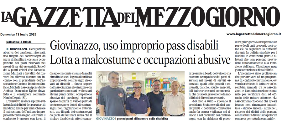 Il giorno 2 luglio 2025 si è tenuto un importante incontro presso la sede dell’Associazione Mutilati e Invalidi del Lavoro, volto ad affrontare le problematiche relative all’utilizzo del contrassegno per portatori di handicap. All’incontro hanno partecipato il presidente dell’associazione ospitante, Stufano Cosimo Damiano, il presidente dell’ANFFAS Michele Lasorsa, il rappresentante degli invalidi Domenico Eplite, e il consigliere comunale di Sinistra Italiana Nando Depalo, anch’egli invalido civile. Durante il confronto è emerso con forza il disagio crescente vissuto da molti cittadini e soci, legato all’utilizzo improprio dei contrassegni riservati ai disabili. In particolare, sono stati evidenziati i seguenti punti critici: